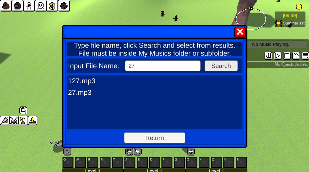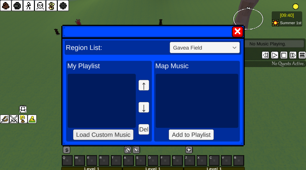 A game without music can eventually get boring, even more for a roleplaying game. The game has got a Music Playlist system, where it will have playlists of musics setup for the maps. Currently, the game doesn't have its own soundtrack, but you can customize it with local music.